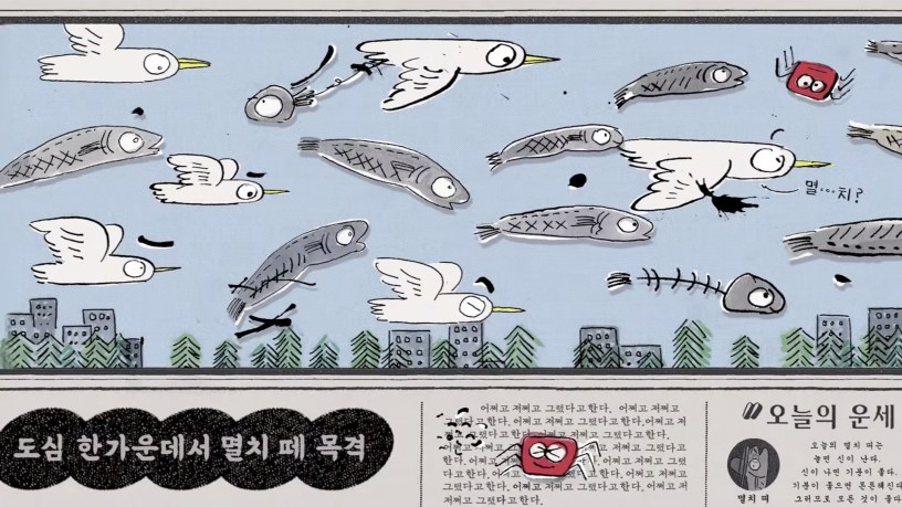 ☆ 멸치를 다듬을 때 반드시 필요한 것은? 섬세한 손끝 감각과 튼튼한 어깨, 그리고 바로 부스러기를 받쳐 줄 ‘신문지’이다. 널따랗게 펼쳐 둔 신문지 위 수북한 멸치들 틈에는 어리둥절 딸려 온 게나 꼴뚜기도 섞여 있게 마련. 오늘자의 특종 소식과 기상 예보, 띠별 운세, 구인 구직 공고, 생활 정보와 토막상식, 네컷만화와 연재소설까지 신문지 속 세상은 어질어질할 정도로 다채롭고 흥미롭다. 기다리기 지루했던 멸치들은 어느새 땡그란 눈을 빛내며 몸을 풀기 시작한다. 바다 밖 세상이 이렇게 재미났던가? 그럼 어디 한번, 들어가 볼까?