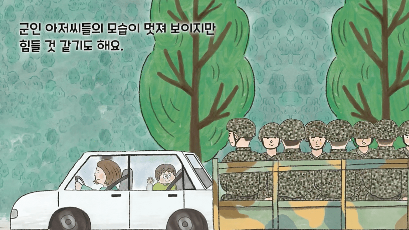 전 세계 유일한 분단국가인 우리나라는 군사 분계선을 경계로 남과 북이 나뉘어 있어요. 그곳과 인접한 지역을 접경 지역이라고 불러요. 이 동네는 도로 한가운데로 탱크 행렬이 지나가고 한밤중에 헬기들이 날아다니고, 포탄 터지는 소리에 땅이 울리기도 하지요. 상점, 버스, 거리 등 동네 곳곳에서 군인들이 북적거리고요. 우리나라의 특수한 상황과 지역 사회의 다양성을 따뜻한 일상으로 담아낸 그림책.